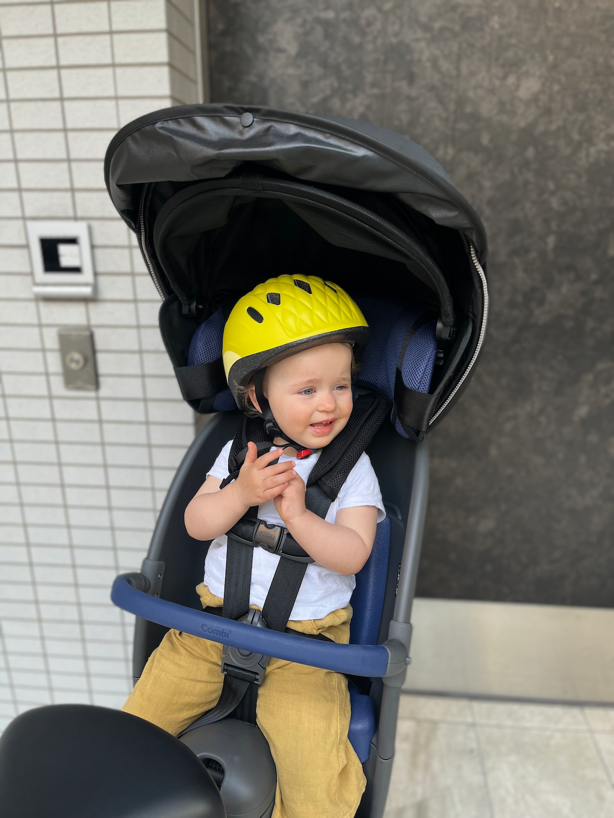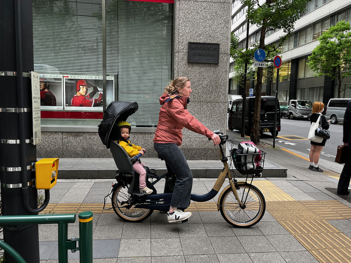 Das sogenannte Mama Chari 〈ママチャリ〉 hat hinten einen bequemen Sitz für Charlotte, der bei Regen komplett zugemacht werden kann, sodass sie im Trockenen sitzt. Einen großen Einkaufskorb für Vorne gibt es dazu. Bei Bedarf kann dort auch noch ein zweiter Kindersitz montiert werden. Nicht selten sieht man Mütter, die zwei Kinder - eins vorne, eins hinten - im Fahrradsitz haben und dann das dritte in der Trage durch Tokio kutschieren. So ersetzt das Fahrrad den Kinderwagen (auch bei uns schon der Fall – obwohl der Micro Buggy noch immer auf der Wunschliste steht).