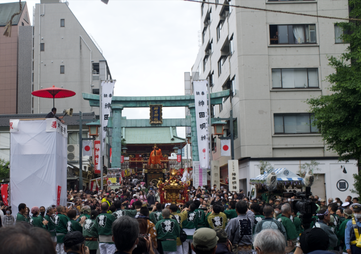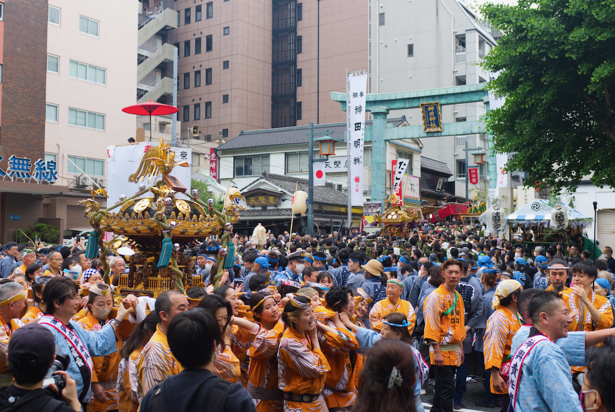 Nachdem die Sänften schon am Freitagabend und während des Samstags durch verschiedene Ecken des Stadtviertels getragen wurden, fanden am Sonntag alle den Weg zum Hauptschrein unseres Stadtteils, dem Kanda Myōjin 〈神田明神〉. Die Sänften werden beim Tragen rhythmisch geschüttelt und machen Besuche bei den lokalen Geschäften, um Glück und gute Geschäfte für die nächsten beiden Jahre zu bringen. Im Gegenzug bekommen die TrägerInnen dort etwas zu essen und zu trinken.